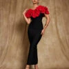 Elevate your style with our Adlai Strapless Flower Bandage Midi Dress! The sleek and chic design of this dress will make you stand out at any event. Show off your figure and make a statement with the flower bandage detailing. Perfect for a night out or special occasion.