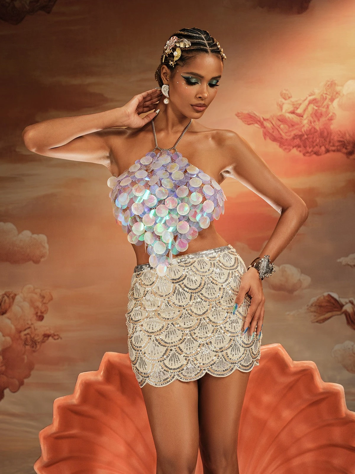 Unleash your inner mermaid with the Akili Halterneck Sequin Scale Top! Featuring a stunning mermaid scale design and a flattering halterneck style, this top will have you shining like a star at any event. With its high-quality sequin material, you’ll feel like a true sea goddess. Don’t miss out on this magical piece!