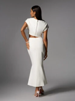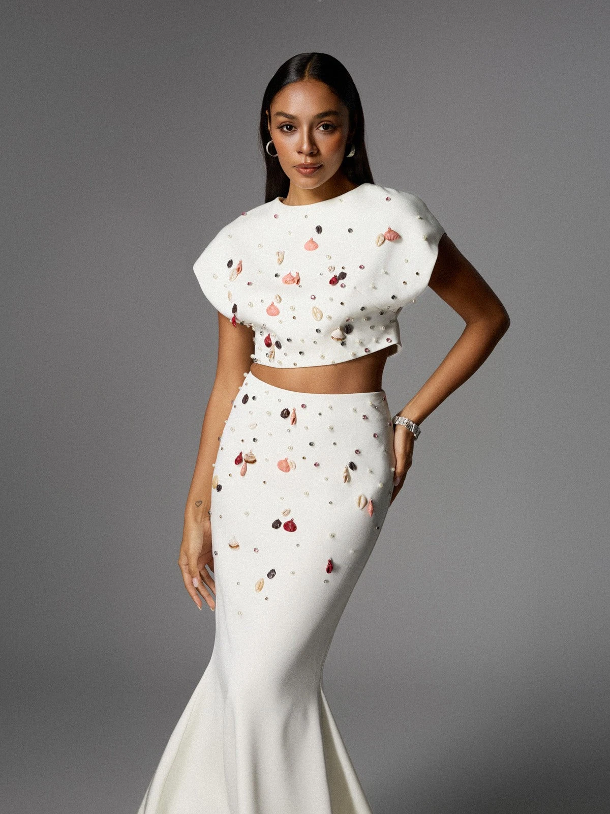 Indulge in the luxurious elegance of the Alaura Seashell Pearl Skirt Set. The intricate seashell pearl design adds a touch of sophistication to this stylish set. Perfect for any special occasion, this set will make you feel confident and beautiful. Elevate your wardrobe with this stunning addition today!