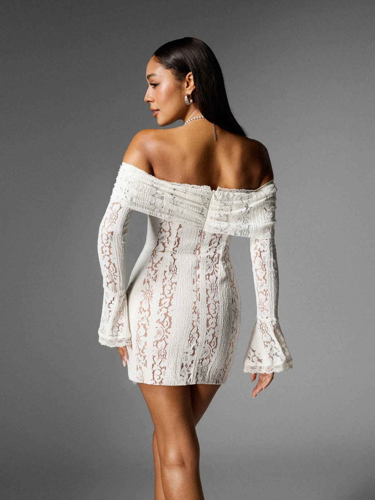 Introducing the Albane Off Shoulder Lace Mini Dress, the perfect combination of elegance and style. Featuring a beautiful off-shoulder design and intricate lace detailing, this dress is sure to make you stand out at any event. With its versatile silhouette, it can be dressed up or down for any occasion. Get ready to turn heads and make a bold fashion statement with the Albane dress!