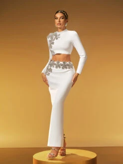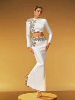 Elevate your style with the Almira Long Sleeve Flower Bandage Skirt Set in White. This elegant set features a flattering bandage skirt paired with a delicate long-sleeve top adorned with subtle floral details. Perfect for making a graceful statement at any event, it combines comfort and sophistication effortlessly. Embrace timeless charm and confidence in this beautifully crafted ensemble.