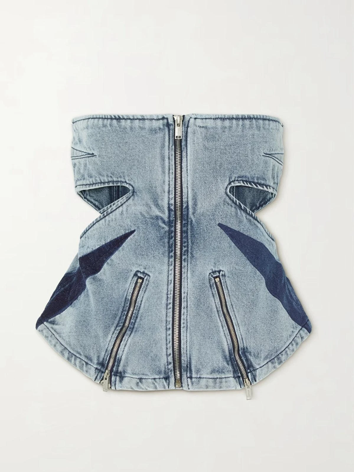 Bring fashion-forward style to your wardrobe with the Amarel Strapless Cutout Zip Denim Top. Crafted from a stretch denim fabric, the top features stiffened edging and zip details for a contemporary look. With a flattering cutout neckline, it’s perfect for adding a touch of edge to your outfit.
