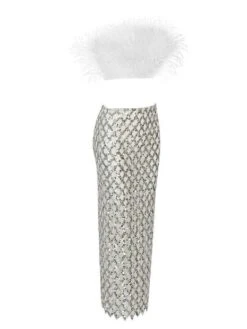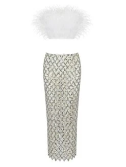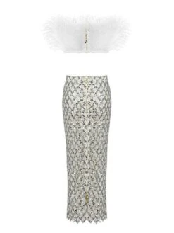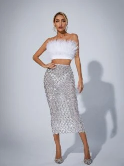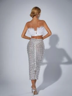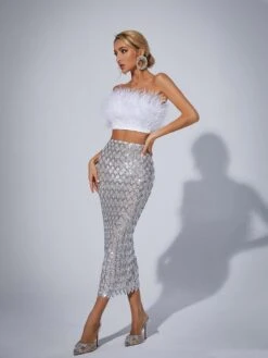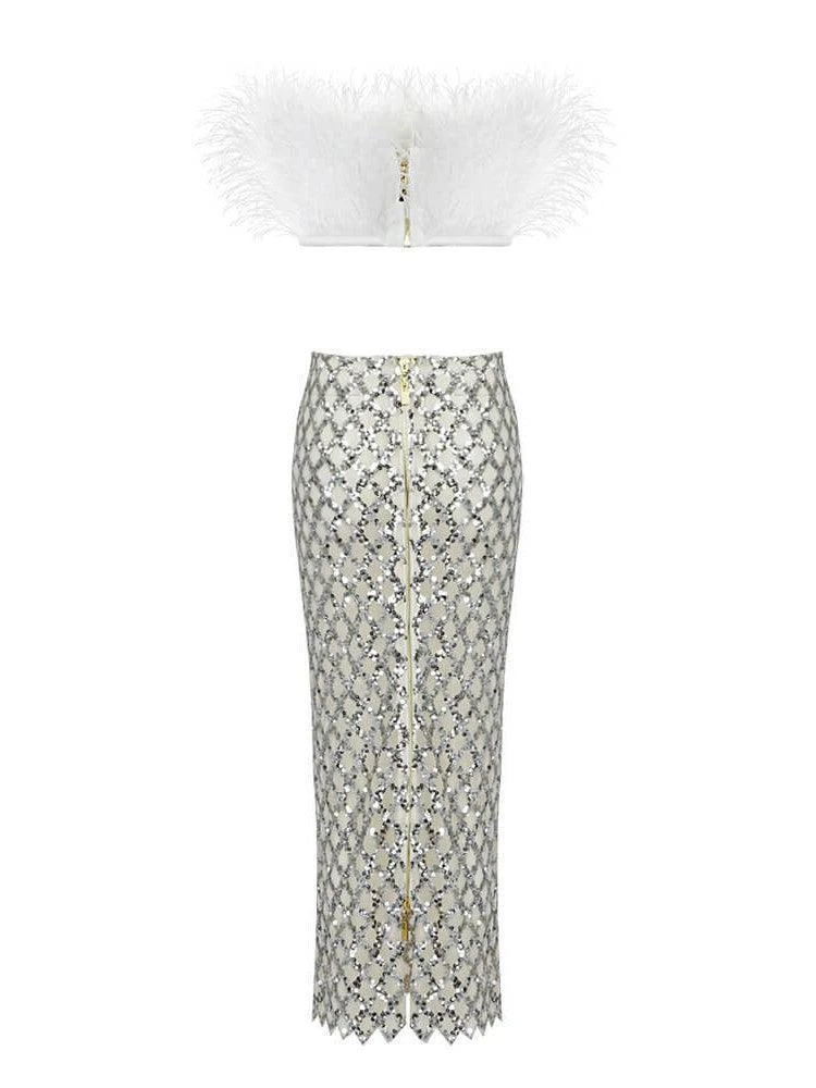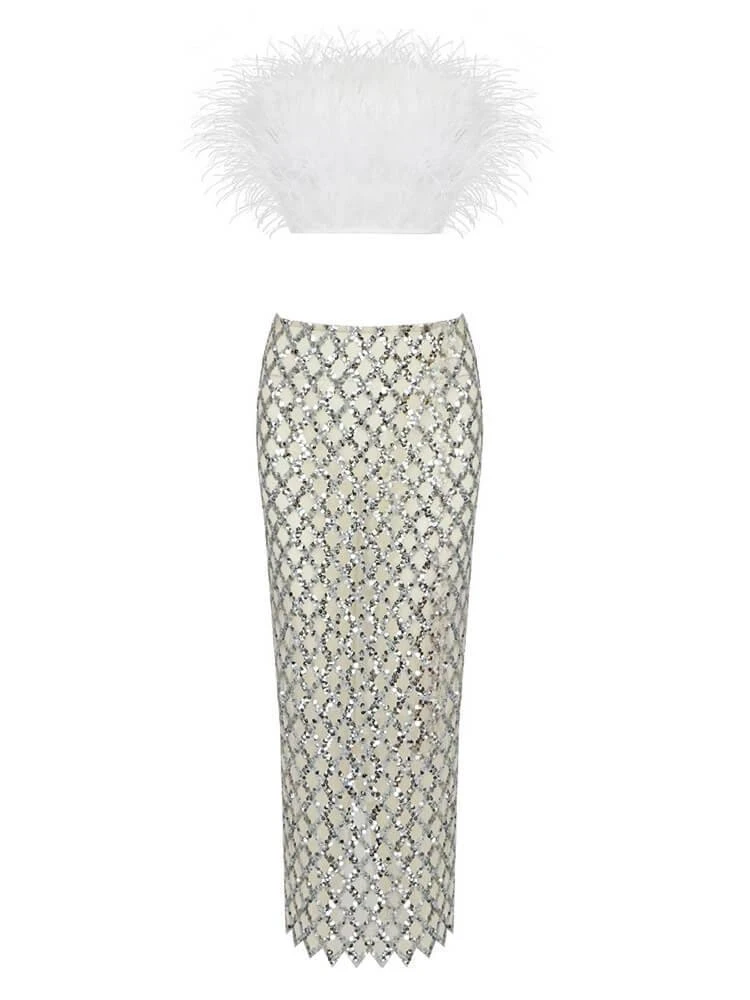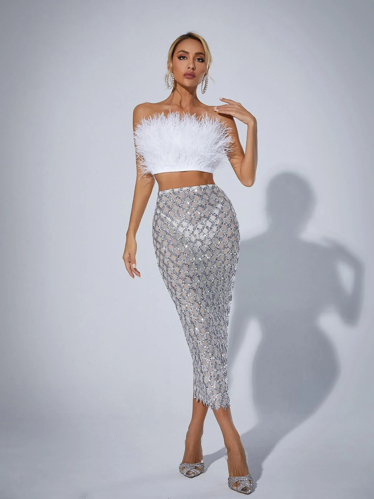 The Ansley Strapless Feather Mesh Skirt Set In White is the perfect statement piece for nights out! This adorable tube top features a faux feather details and a cropped silhouette. This skirt features a mesh fabric with full sequins. Wear it with sparkling earrings and heels for a dazzling look.