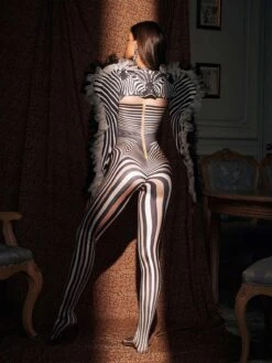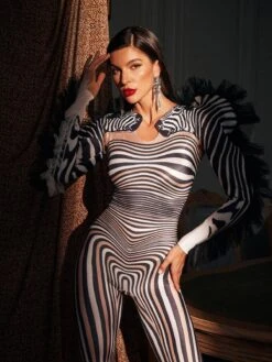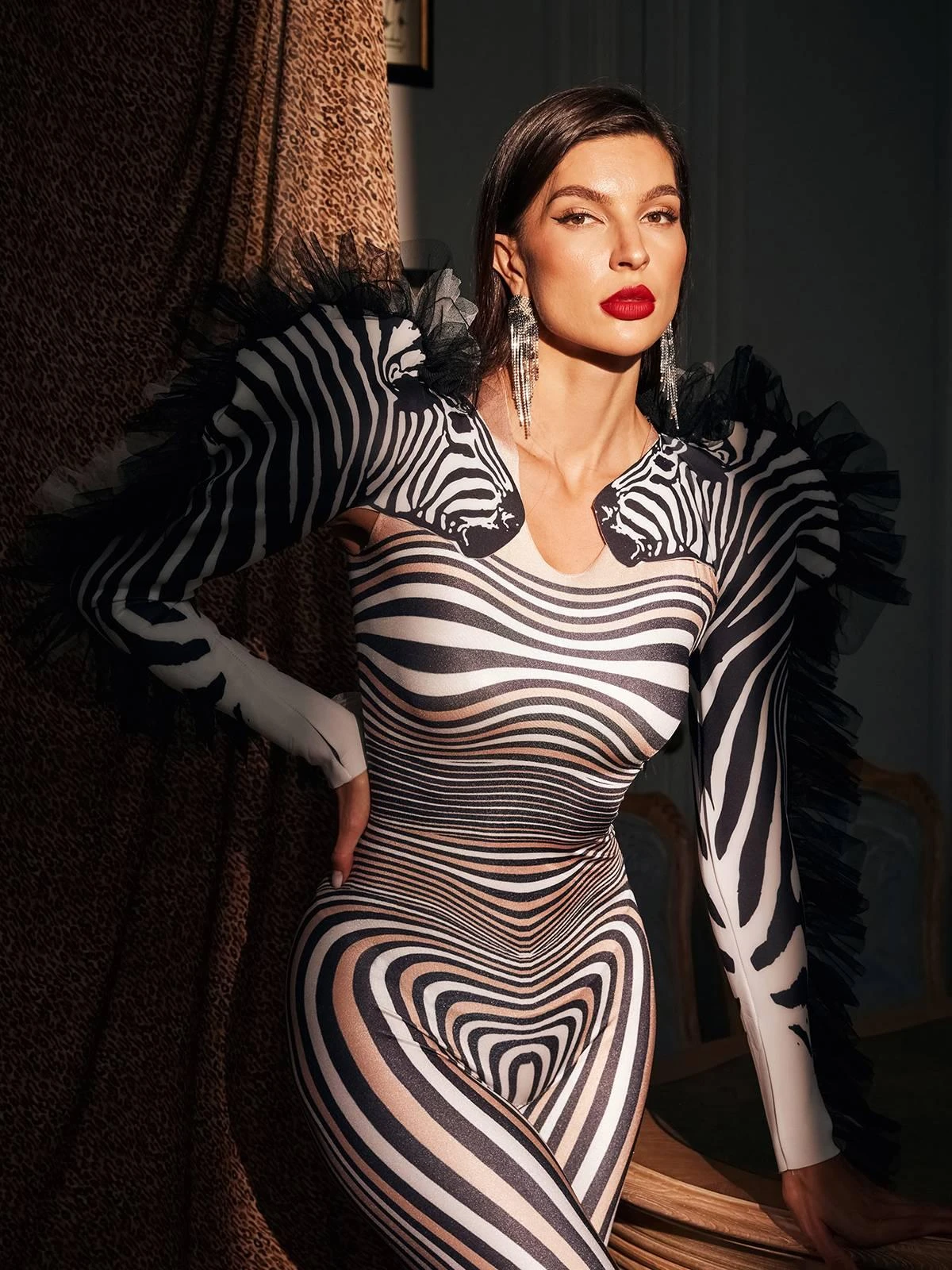 Elevate your style with the Assisi Tulle Trimmed Zebra Printed Jumpsuit. Made with high-quality materials, this jumpsuit features a unique zebra print and delicate tulle trim. Perfect for making a bold statement at any event, this jumpsuit combines sophistication and trendy fashion for a truly one-of-a-kind look. Add this eye-catching piece to your wardrobe today!