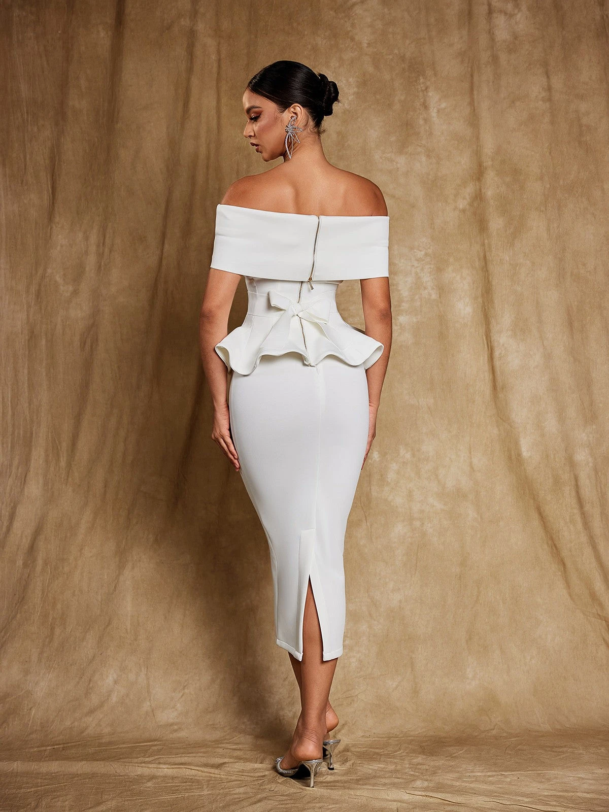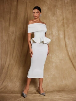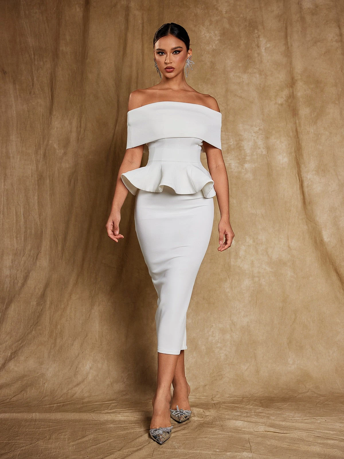 Unleash your inner fashionista with our Augustus Off Shoulder Flounce Midi Dress. The stunning off-shoulder design and elegant midi length will make you the talk of the town. Feel confident and stylish with every step you take in this must-have dress.