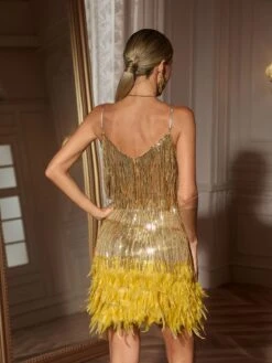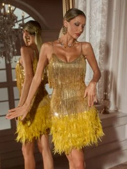 Be the shining star of any event in this Austyn Tassel Feather Mini Dress In Gold. With its stunning gold color and tassel feather detailing, you’ll make a statement wherever you go. Feel confident and elegant in this one-of-a-kind dress. Perfect for any special occasion!
