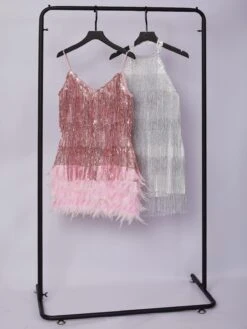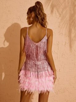 Austyn Tassel Feather Mini Dress In Pink is destined to make herself known at the most extravagant parties. The ultimate show-stopping, party dress you will stand out wearing her. Adorned in pink fringing and sequins with flat beaded panelling on the waist to accentuate your curves and flatter your figure. Individually hand embellished with pink crystal waterfall fringe to create a mesmerising illusion when worn.