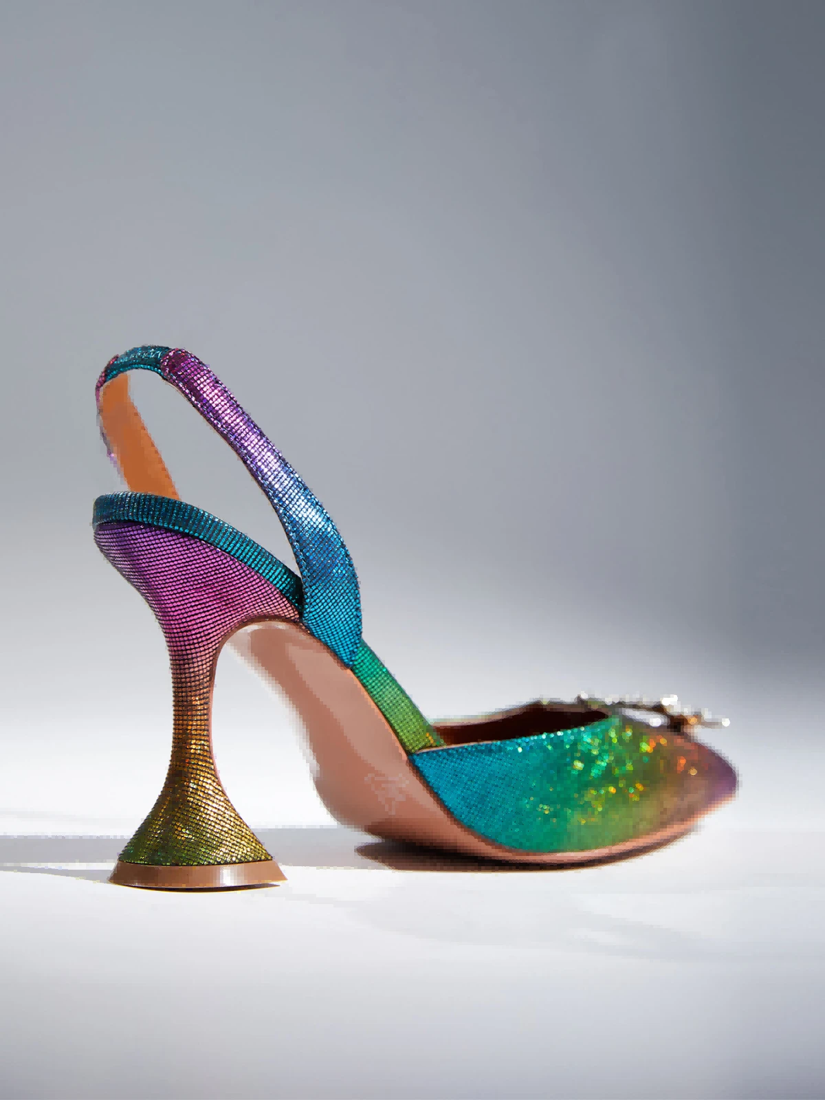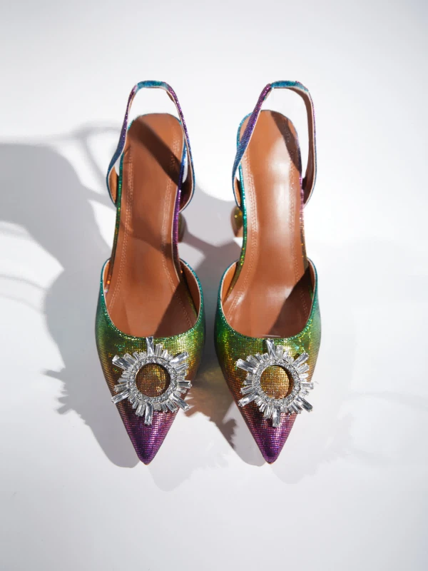 Step into the spotlight with our Avalira Rhinestone Slingback Flared Heels. These multi-colored statement shoes combine dazzling rhinestone embellishments with a comfortable slingback design and eye-catching flared heels. Perfect for special occasions when you want to turn heads and elevate your outfit with a touch of glamour and sophistication.