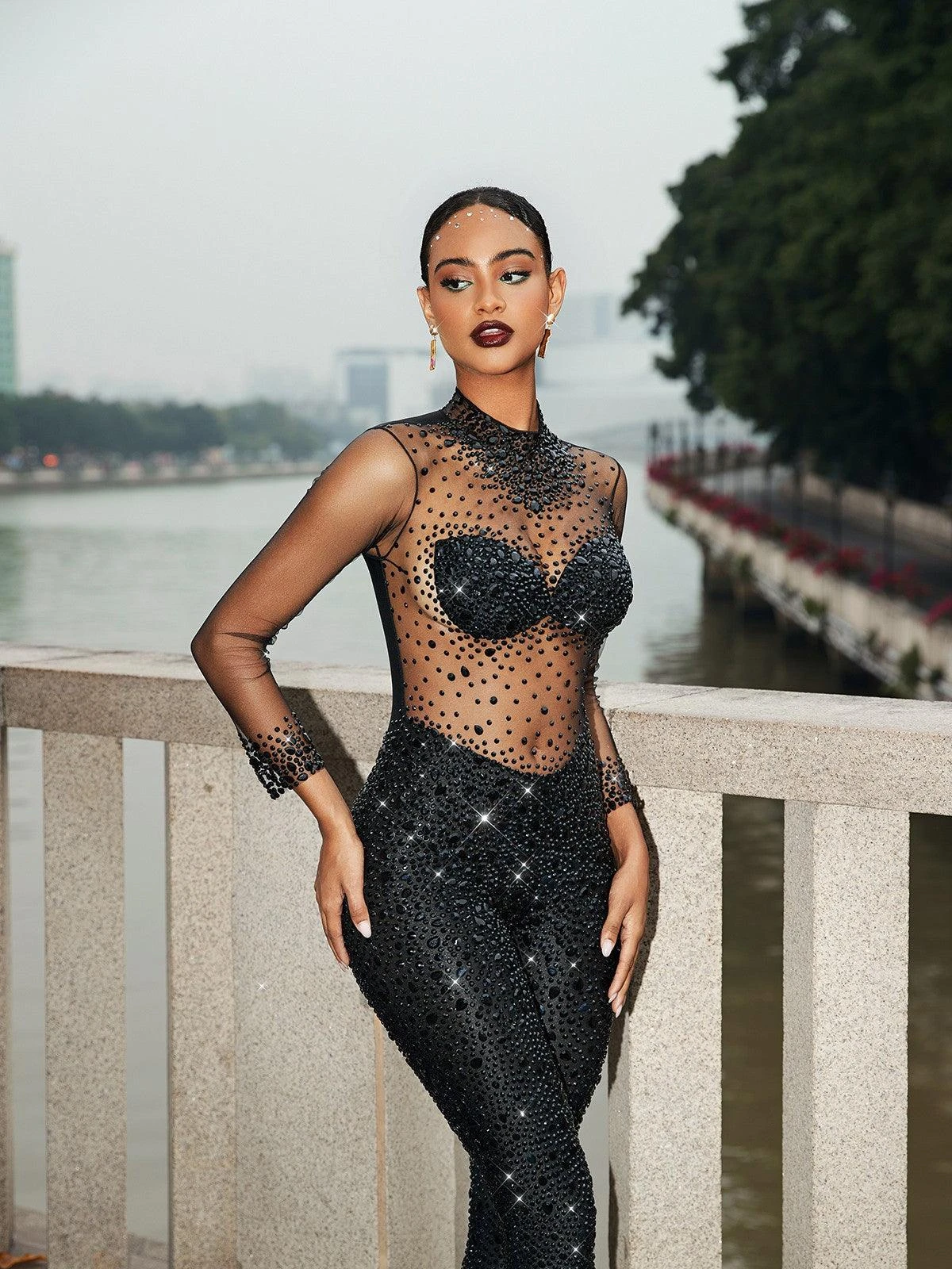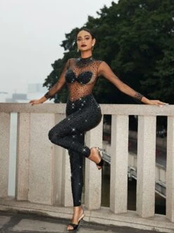 Introducing the Azami Mesh Crystal Jumpsuit In Black, a stunning addition to your wardrobe. Crafted with high-quality mesh material and adorned with delicate crystals, this jumpsuit offers both style and comfort. With its elegant design, it is perfect for any special occasion, making you stand out in the crowd.