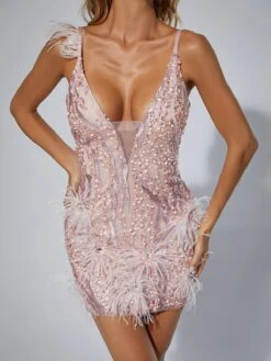 Sparkle and shine in this Bella Mini Bodycon Dress In Pink with shimmering silver sequins. The dress is detailed with sheer mesh panels and features spaghetti straps, a plunge V-neckline, and a tight bodycon fit. Team it with strappy heels for a fun look that you can party in all night long.