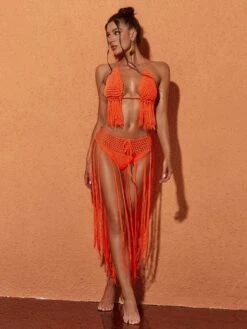 Hit the beach in provocative style with the Berlin Knit Fringe Bikini Two Piece Set In Orange, featuring a halterneck top and knit bottom adorned with fringe. The perfect two-piece set for a daring beach look.