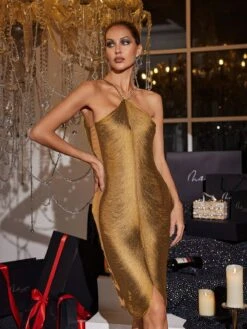 Elevate your style with our Bluma Halterneck Fringe Midi Dress! Featuring a stunning halterneck design and sparkling crystal strap, this dress will make you stand out from the crowd. The fringe detailing adds a touch of playfulness while the classic gold color makes it versatile for any occasion. Make a statement and turn heads with this must-have dress!