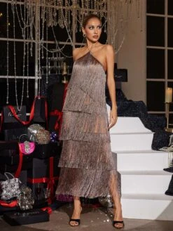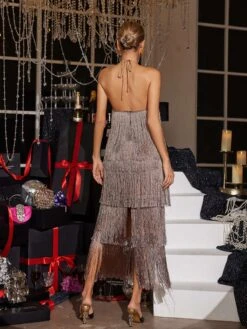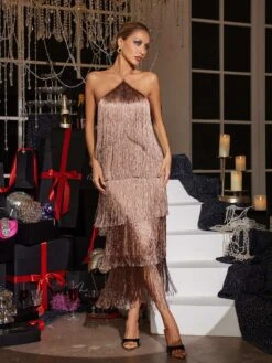 Elevate your style game with our Bluma Halterneck Fringe Tiered Midi Dress in brown! The halterneck design and fringe detailing adds a touch of sophistication, while the tiered construction creates a flattering silhouette. Perfect for any occasion, this dress is a must-have for every wardrobe.