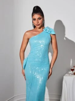 Dazzle in our Cailynn One Shoulder Bow Sequin Maxi Dress! The one shoulder design adds an alluring touch, while the bow detail and sequin embellishments bring glamorous appeal. Perfect for special occasions, this dress will make you feel confident and chic.