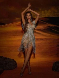 This Calico Crystal Fringe Mini Dress will bring a touch of sparkle and glamour to any occasion. Crafted from soft, high-quality materials, it features a crystal fringe and a mini length for an eye-catching, stylish look. Perfect for adding a touch of elegance to any outfit.