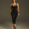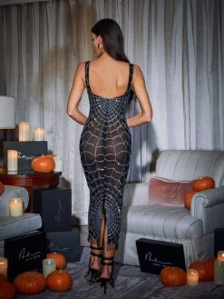 Step out in style with our Calyx Scoop Neck Cobweb Sequin Midi Dress In Black. This stunning dress features a flattering scoop neck design and intricate cobweb sequin detailing, making it the perfect choice for any formal occasion. With its midi length, it offers a sophisticated look while still allowing for comfortable movement. Elevate your wardrobe with this elegant and eye-catching dress.