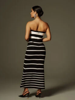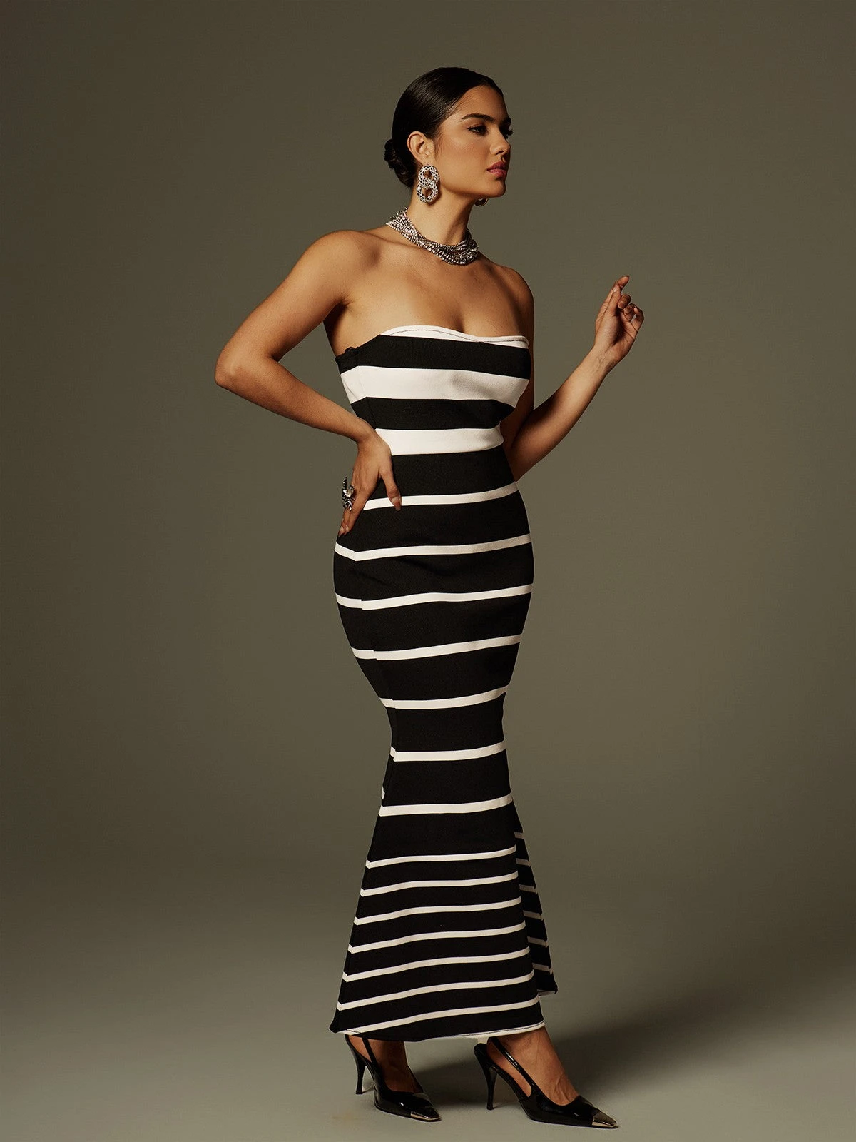 Unleash your inner fashionista with the Cathee Strapless Stripe Bandage Maxi Dress. This stunning dress features a flattering strapless design and eye-catching stripe pattern that will turn heads. Crafted with high-quality bandage material, this dress will hug your curves and make you feel confident and stylish. Perfect for any special occasion or a night out, this dress is a must-have for your wardrobe.