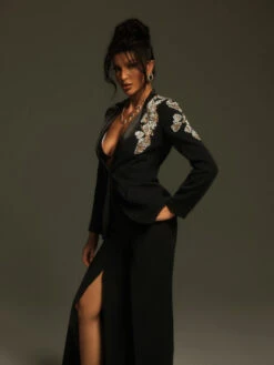 Elevate your style with the Cathia Rhinestone Split Blazer Set! This sophisticated set features intricate rhinestone detailing on the blazer for a touch of glamour. The split design adds a modern twist and allows for easy movement. Perfect for any special occasion, this set will make you feel confident and stylish.