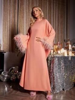 Look stunning in this Ceridwen Long Sleeve Feather Maxi Dress In Orange. Its ultra-luxe design, featuring an elegant long sleeve and a graceful maxi silhouette, is sure to turn heads. Step into this exquisite piece for a look you won’t forget. Experience unparalleled beauty with this one-of-a-kind maxi dress.
