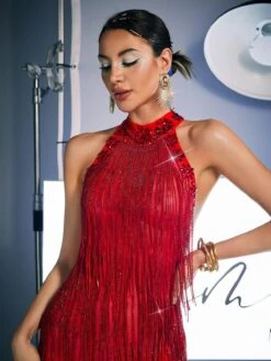 This charming mini dress will make you shine! The Charlize Crystal Fringe Mini Dress features a striking crystal fringe design that adds a special sparkle to any evening look. Its lightweight and mini length make it perfect for an effortless, sophisticated look.