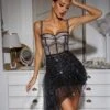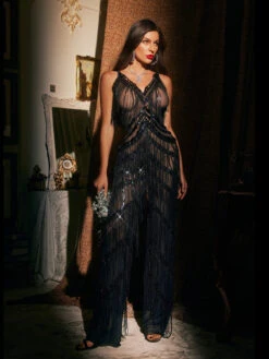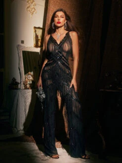 Experience luxury and glamour with our Charnita V Neck Rhinestone Fringe Jumpsuit! The intricately designed V neck and rhinestone details add a touch of elegance, while the fringe adds playful movement to your look. Stand out from the crowd and exude confidence in this stunning jumpsuit.