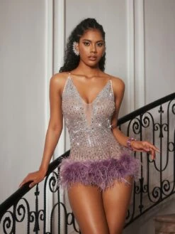 Add a touch of glamour and allure to your wardrobe with the Charsian V Neck Rhinestone Feather Bodysuit! Its stunning v-neck cut, sparkling rhinestones, and delicate feather details will make you feel like a true fashion icon. Perfect for a night out, this bodysuit will turn heads and make you feel confident and beautiful.