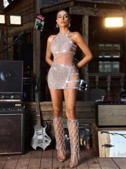Indulge in luxury with the Corvain Rhinestone Mesh Mini Dress In Silver. Adorned with sparkling rhinestones and crafted from delicate mesh, this dress will make you shine like a star. Perfect for special occasions and parties, it will make you the center of attention and leave a lasting impression.