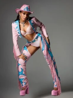 Saddle up in style with the Cyrviel Fringe Cowgirl Outfit In Pink. This eye-catching ensemble combines playful fringe details with a flattering silhouette that’s perfect for festivals, country concerts, or making a statement. The vibrant pink hue ensures you’ll stand out from the crowd while the quality craftsmanship guarantees comfort all day long. Turn heads and embrace your inner cowgirl with this must-have addition to your wardrobe.