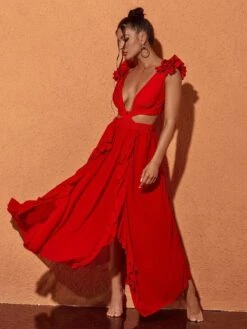 Keep your look fresh with this Danni Cutout Swimwear Two Piece Set In Red. The cutout bikini top and matching maxi skirt show off your curves in a fun and flirty way that’s perfect for any summer outing. Enjoy the comfort and style of a two-piece set with a modern twist.