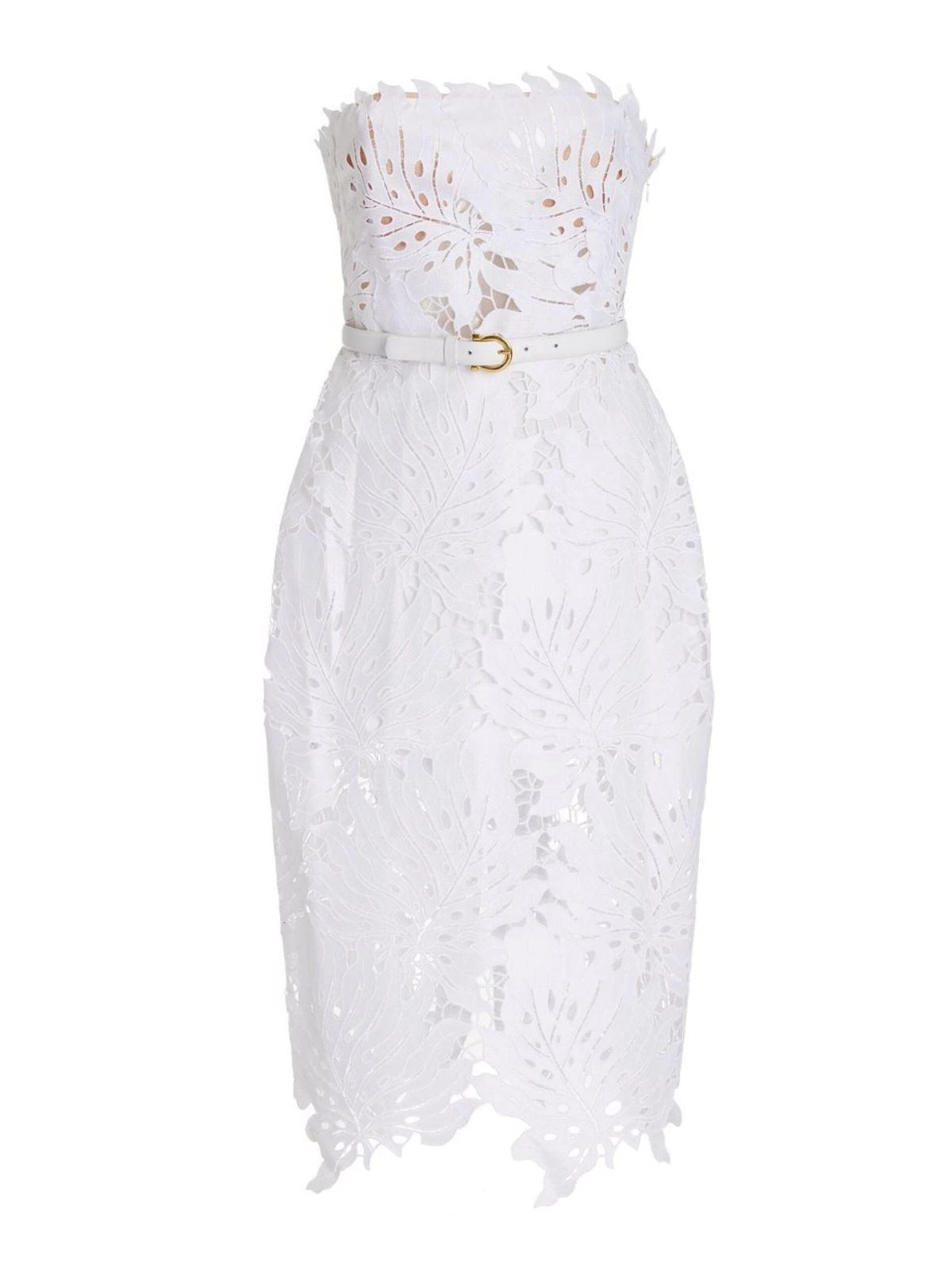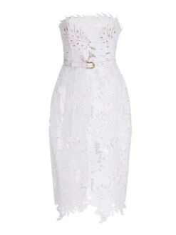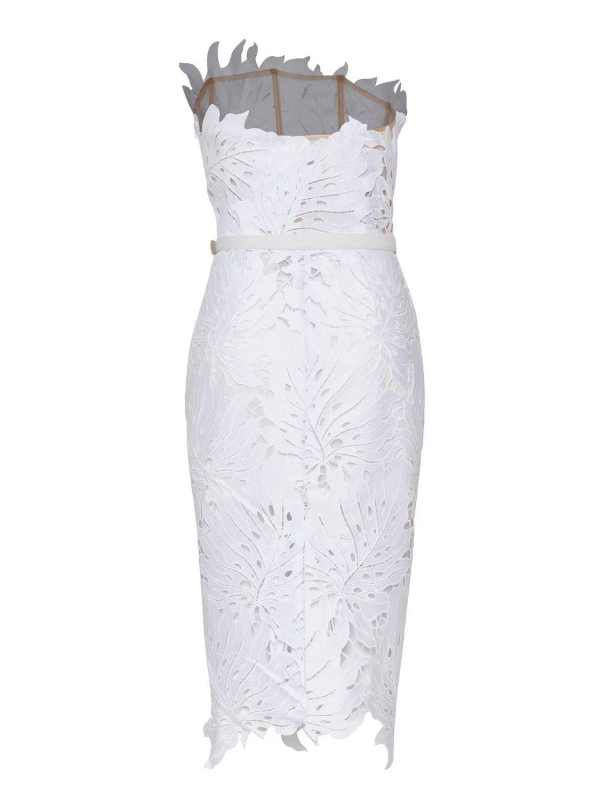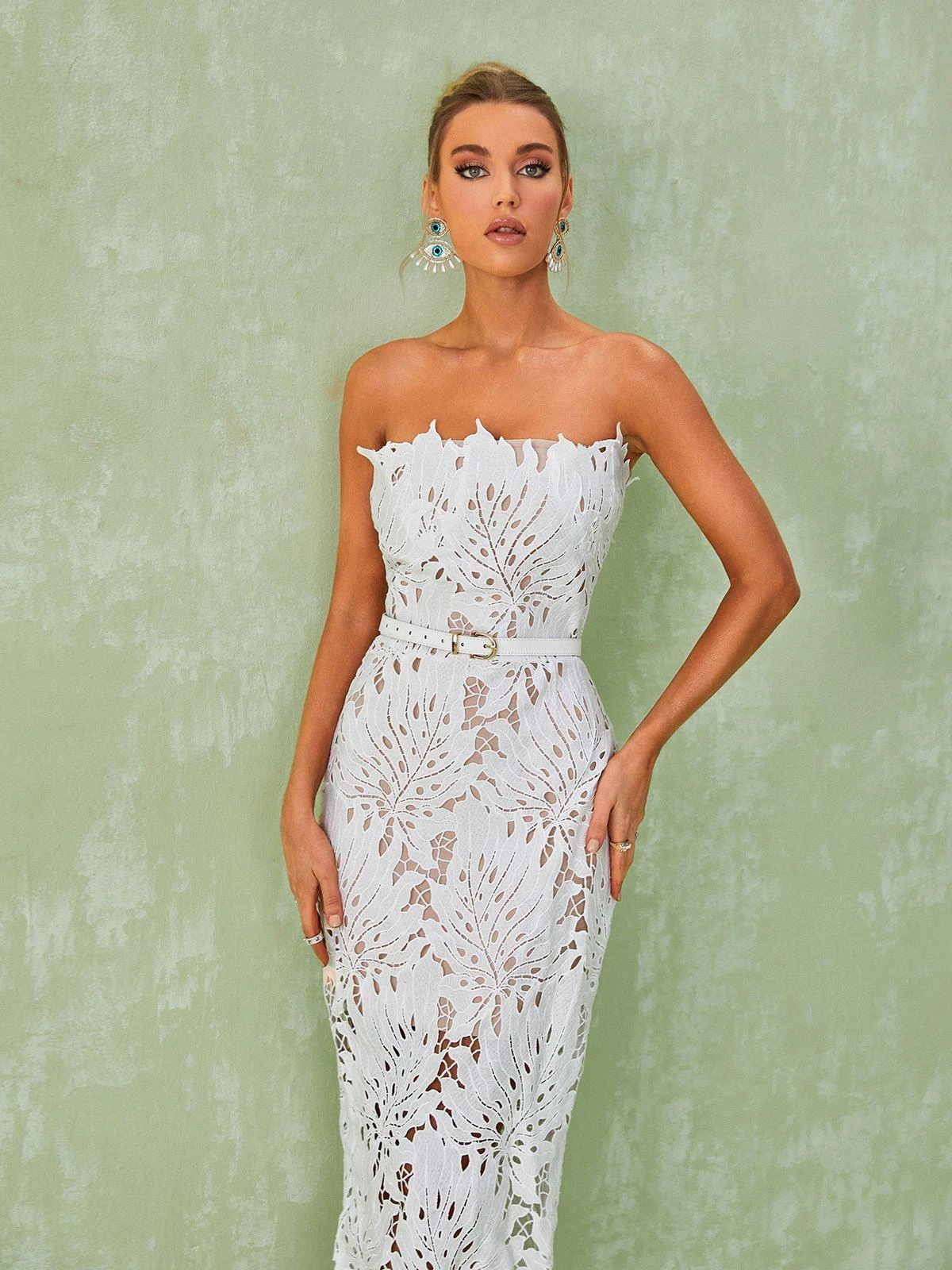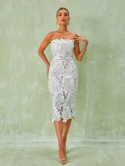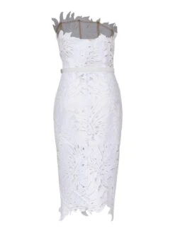 The Despina White Lace Midi Dress is the perfect finishing touch for any outfit. Its lace fabric and midi length lend a classic yet timeless look, while its strapless design makes it the ideal choice for any special occasion. Enjoy a sophisticated, feminine look all night long.
