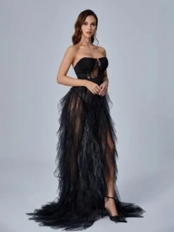 Have all eyes on you at your next special occasion in this stunning dark pink tulle ballgown from Dorothy Tulle Maxi Dress In Black. Featuring a strapless neckline, and a dramatic tiered tulle skirt, this glamorous gown is perfect for prom.