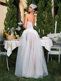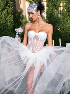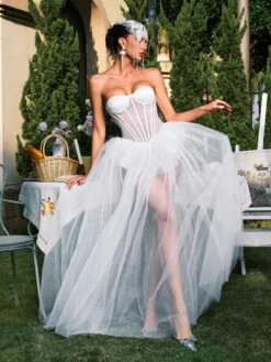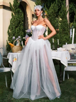 Elevate your style with our Eddard Strapless Corset Mesh Maxi Dress! Designed to accentuate your curves, this dress features a flattering corset waist and a flowy mesh skirt. Perfect for any special occasion, it will have you feeling confident and glamorous.