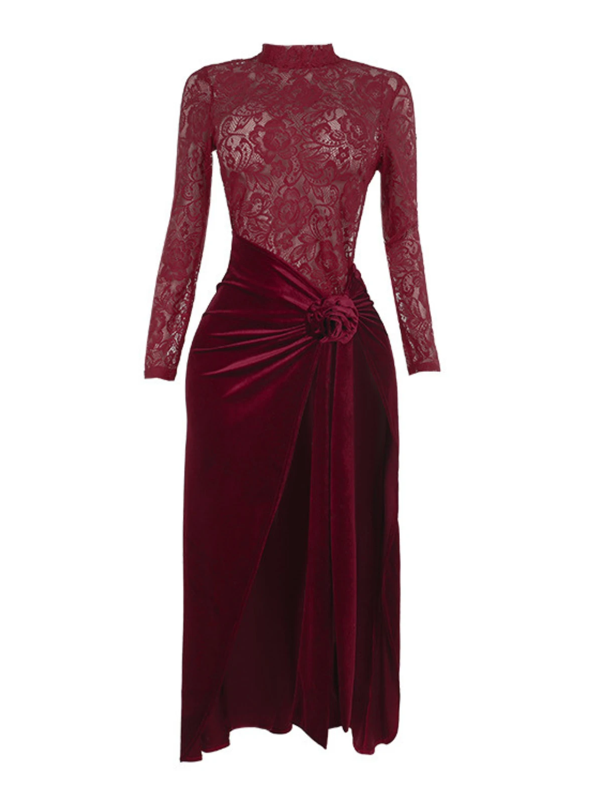 Experience the ultimate in elegance and femininity with the Eldrian Flower Ruched Split Lace Velvet Maxi Dress. This stunning dress features delicate lace detailing, a figure-flattering ruched design, and a luxurious velvet fabric, making it the perfect choice for any special occasion. Command attention and radiate confidence in this must-have dress.