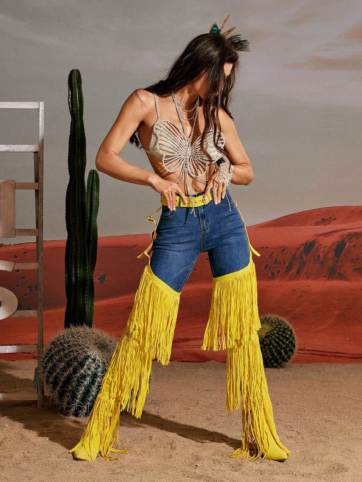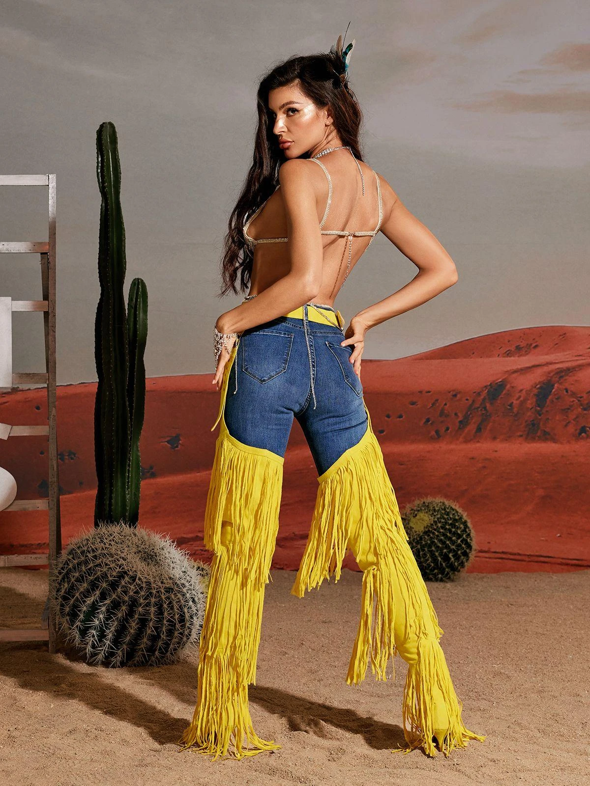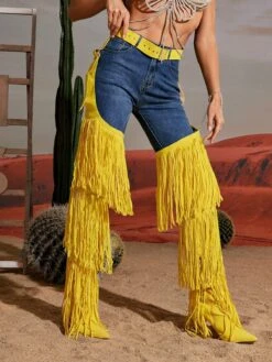 Elevate your style with Eleni Denim Fringe Printed Boots In Yellow. These trendy boots feature a unique denim material with playful fringe details in a sunny yellow hue. Add a pop of color to any outfit and make a statement with these eye-catching boots.