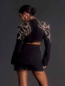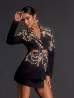 Make a statement with the Emelye Long Sleeve Rhinestone Cutout Blazer. The perfect combination of elegance and edginess, this blazer will add a touch of glamour to any outfit. The sparkling rhinestone cutouts make a bold statement, while the long sleeves provide both style and warmth. Elevate your look with this must-have blazer!
