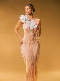 Experience elegance and romance in our Ephira Crystal Flower Fringe Maxi Dress. Made with high-quality materials, this dress features intricate crystal flower fringe details that will make you stand out in any occasion. Be the center of attention and exude confidence with this stunning dress.