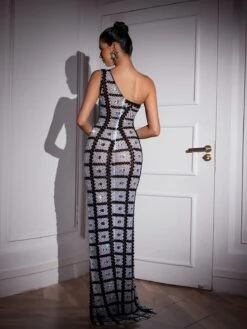 Experience elegance with the Esti One Shoulder Printed Rhinestone Maxi Dress. The stunning one-shoulder design is embellished with sparkling rhinestones, adding an extra touch of glamour to your outfit. The vibrant printed pattern makes a bold statement, making you stand out at any event. Elevate your style and confidence with this must-have dress.
