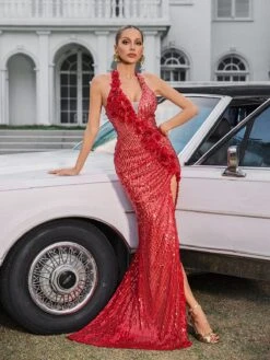 Elevate your style with the Evorine Halterneck Embellished Flower Split Maxi Dress! Featuring a flattering halterneck design and intricate embellishments, this dress is perfect for any special occasion. The split maxi style adds a touch of elegance, while the flowing fabric will make you feel like a goddess. Don’t just dress up, stand out in this stunning piece!