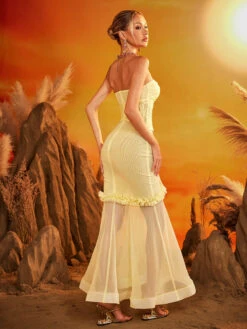 Turn heads with the Ezrion Strapless Lace Up Mesh Maxi Dress, featuring a daring lace-up detail and sheer mesh fabric that exudes confidence and style. The strapless design highlights your shoulders, while the flowing maxi length adds elegance and movement. Perfect for evening events or special occasions, this dress combines bold allure with sophisticated charm to make you unforgettable.