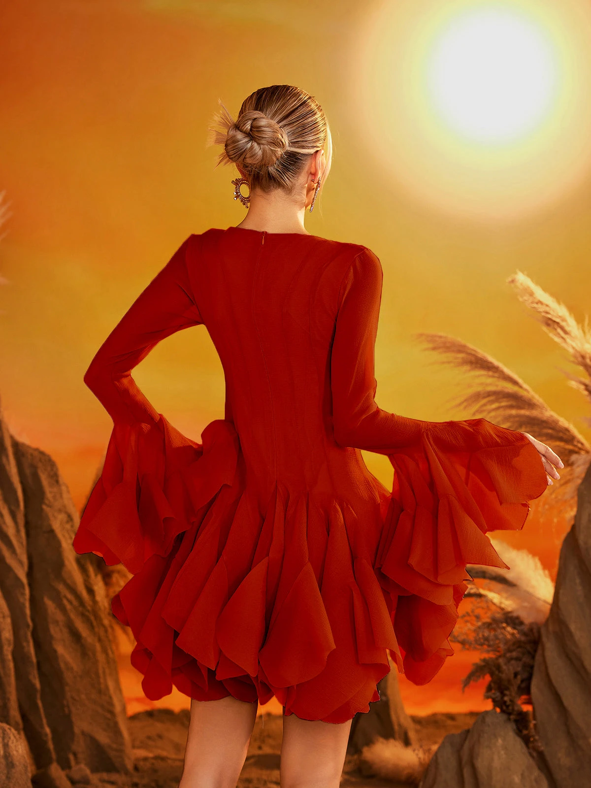 Make a bold statement with the Faldrex Flare Sleeve Ruffle Mini Dress in Wine. Its dramatic flare sleeves and elegant ruffle accents create a striking, feminine silhouette. The rich wine color adds a touch of sophistication, perfect for evening events or special occasions where you want to captivate attention with effortless style.