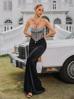 Experience luxury and elegance with the Gerlind Strapless Rhinestone Velvet Maxi Dress. The soft velvet fabric and the dazzling rhinestone details will make you stand out at any event. With its strapless design, you can show off your beautiful shoulders and feel confident and comfortable all night long. Perfect for making a statement and turning heads!