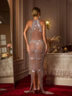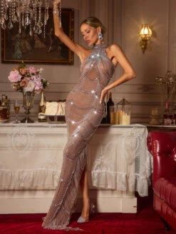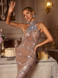 Feel like a goddess in our Gienna Halterneck Rhinestone Split Maxi Dress! This stunning dress features a halterneck design and rhinestone detailing, adding a touch of elegance and glamour to any occasion. The high slit adds a touch of allure, making you stand out and feel confident. Upgrade your wardrobe today with this must-have dress!
