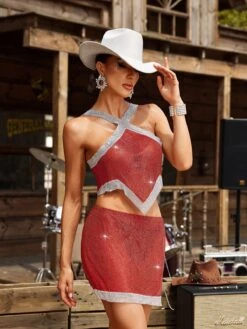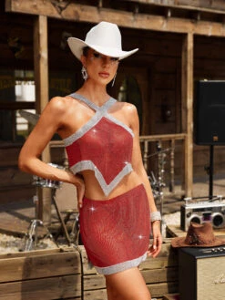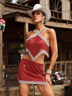 Add some edge and glamour to your wardrobe with our Glenn Crystal Chainmail Skirt Set in Red! This set features a unique chainmail skirt and a matching crop top, perfect for making a statement at any event. Stand out and shine with this bold and eye-catching ensemble.