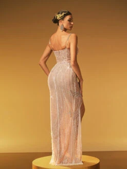 Elevate your evening with the Haldrex Spaghetti Embellished Split Maxi Dress. Featuring delicate spaghetti straps and shimmering embellishments, this dress combines elegance with a daring split for a captivating silhouette. Perfect for special occasions, it offers a flattering fit that moves gracefully with you, ensuring you stand out with confidence and style.