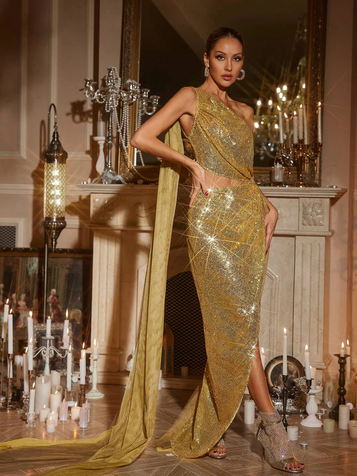 Get ready to turn heads in the Harfford One Shoulder Cutout Sequin Maxi Dress! This stunning dress features a sexy one shoulder design and eye-catching cutouts, all embellished with dazzling sequins. Stand out at any event and feel confident in this statement piece.