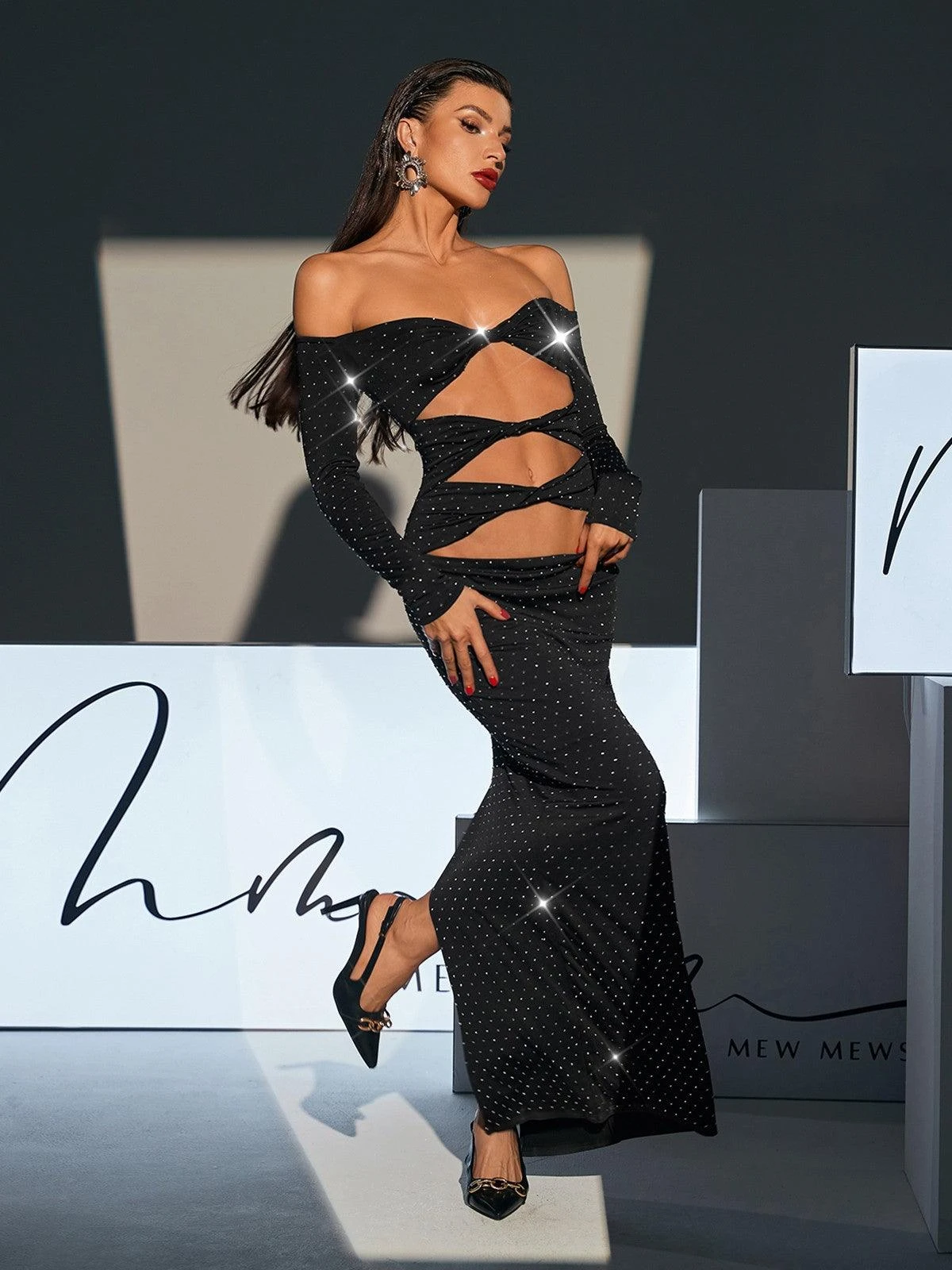 Elevate your style with the Hedwig Off Shoulder Rhinestone Cutout Maxi Dress. Featuring an elegant off shoulder design and stunning rhinestone, this dress is perfect for any special occasion. Its comfortable fabric provide a flattering and comfortable fit. Turn heads and feel confident in this glamorous dress.