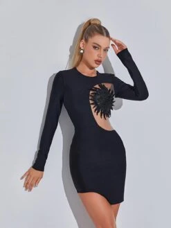 This Hera Long Sleeve Embellished Bandage Dress In Black is everything we are loving for the party season. Featuring a black bandage material with embellished detailing and a figure-hugging fit. Style this with sky-high heels and complete the look with a mini bag.