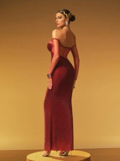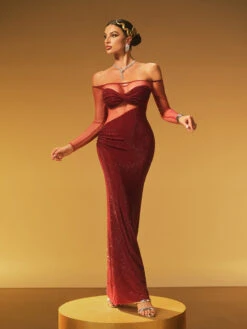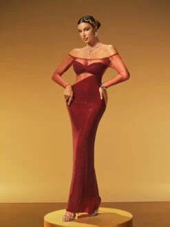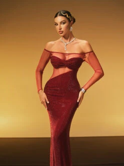 Elevate your evening with the Hyria Off Shoulder Rhinestone Maxi Dress. This elegant dress features a graceful off-shoulder neckline adorned with sparkling rhinestones, adding a touch of glamour to your look. Its flowing maxi silhouette enhances your natural elegance, making it perfect for formal events or special occasions. Step into sophistication and shine with confidence in this stunning dress.