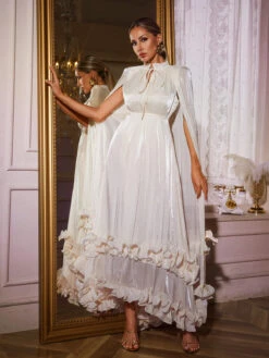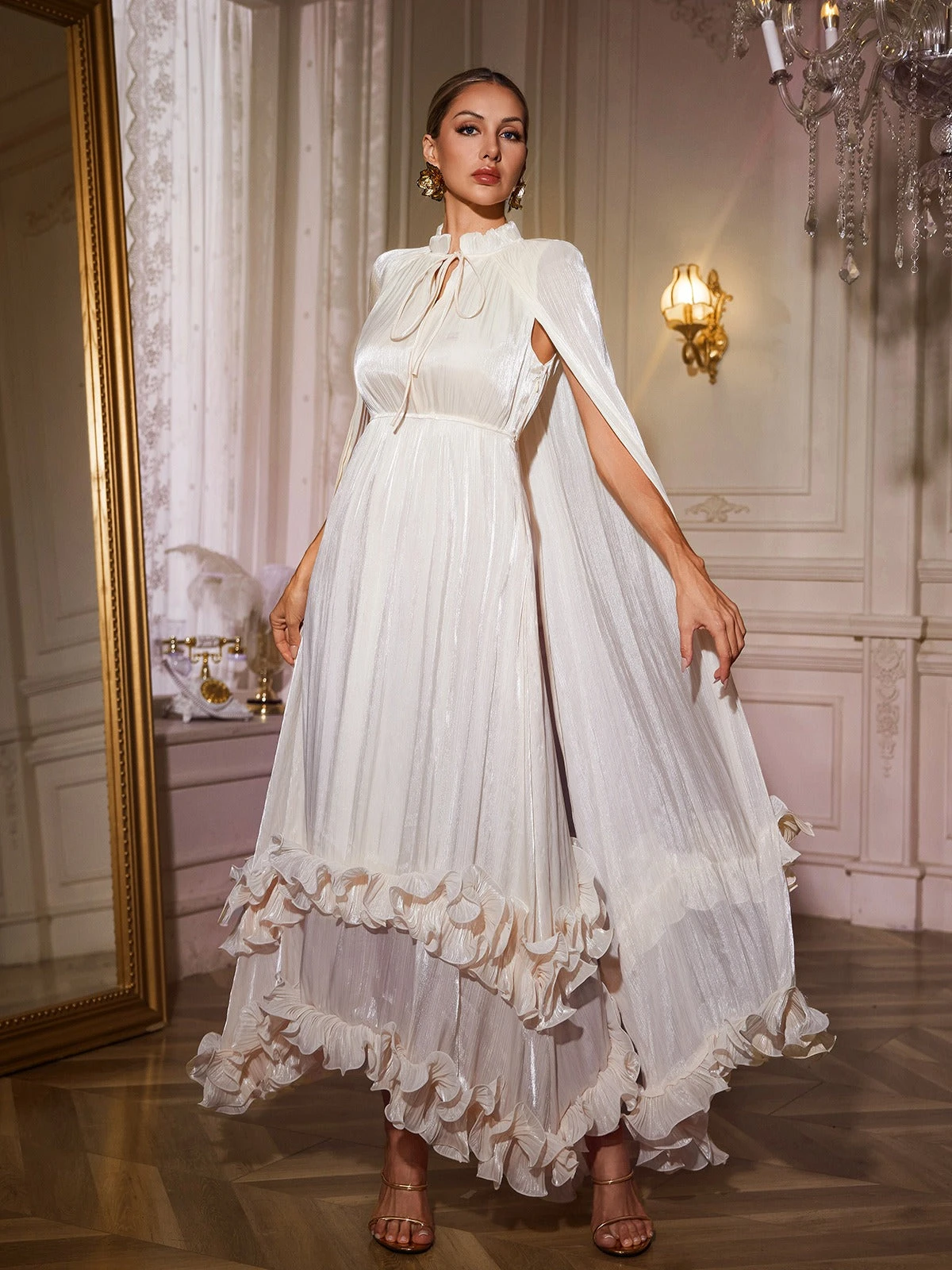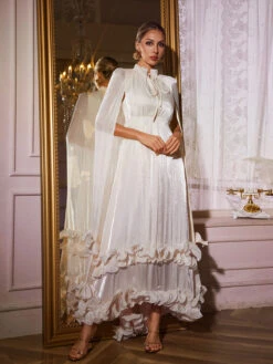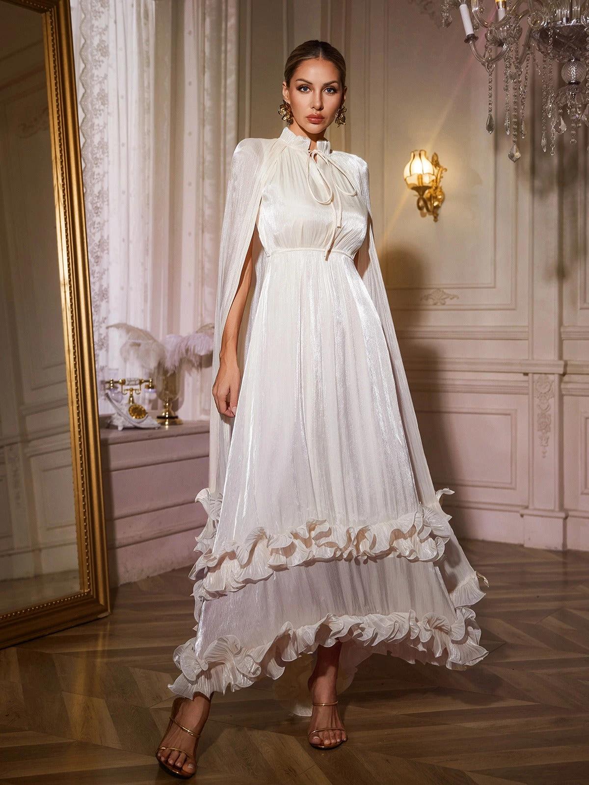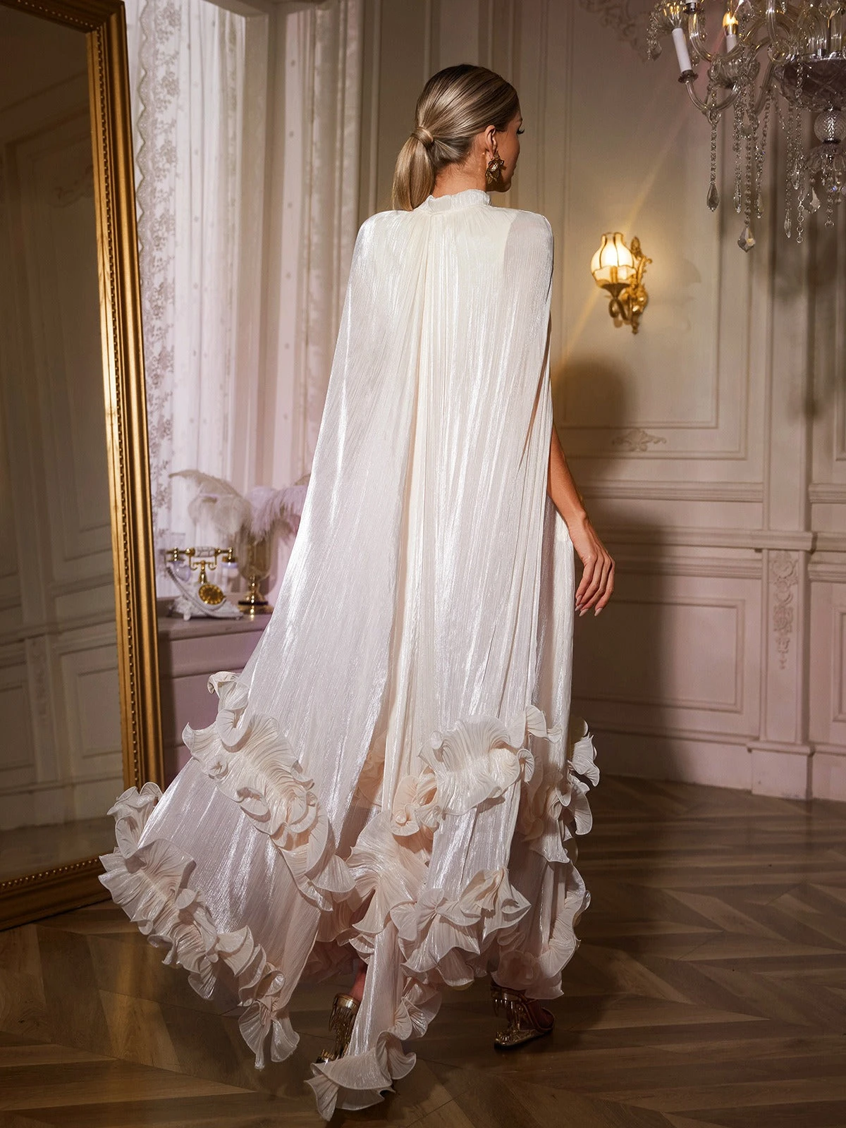 Make a graceful entrance in the Itziar Shawl Ruffle Maxi Dress. Featuring soft shawl sleeves and delicate ruffle details, this dress combines romantic elegance with effortless style. Its flowing maxi length ensures comfort and movement, perfect for special occasions or evening gatherings. Elevate your wardrobe with this timeless piece that exudes femininity and charm.