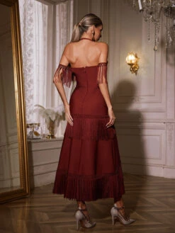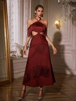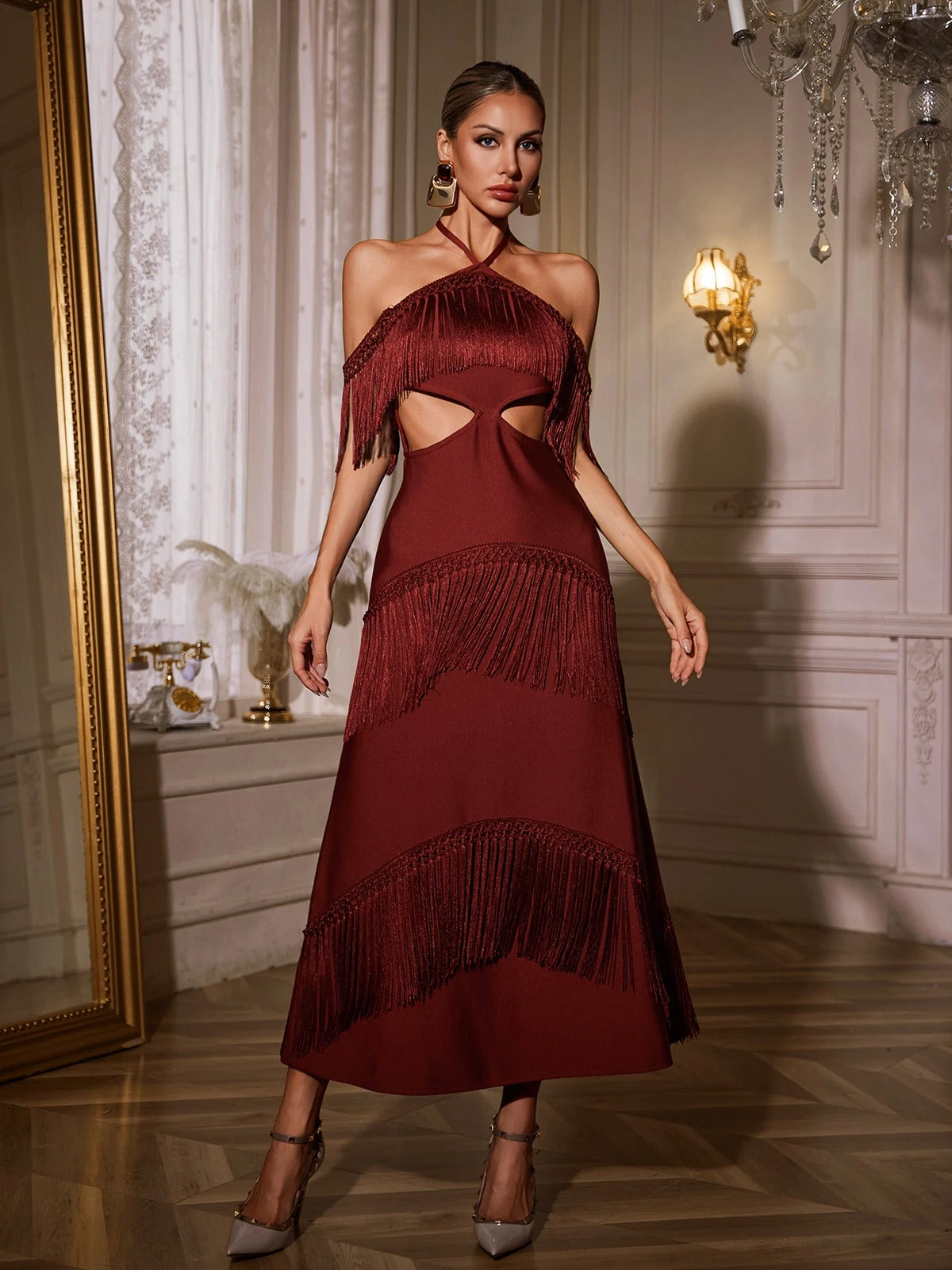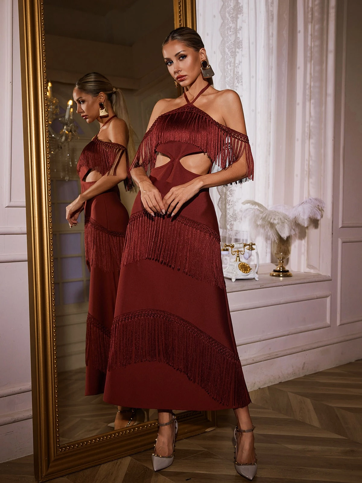 Make a stunning entrance with the Izumi Fringe Bandage Maxi Dress in Maroon. This figure-hugging dress features intricate bandage detailing that sculpts your silhouette, while the playful fringe adds movement and flair. The rich maroon hue exudes sophistication, perfect for special occasions or evening events. Experience confidence and elegance in a dress designed to turn heads wherever you go.